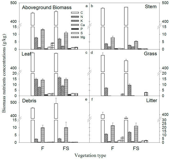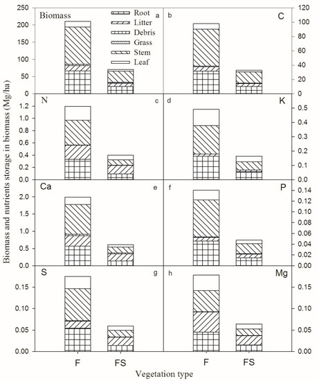 The results displayed in Figure 4 show that no significant difference was recorded in the mean content of all elements for aboveground biomass, trunk, leaf, grass, coarse woody debris (CWD) and litter between the two vegetation types (t-test, p > 0.05). Similarly, the leaf nutrient contents of the same species were not significantly different in the two vegetation types (Table 4). Despite a mean annual precipitation of 1390 mm in this site, the two stands had low total biomass measured (210.89 Mg/ha recorded for F and 70.53 Mg/ha recorded for FS) (Figure 5). In the F stand, the total recorded biomass stocks of C, N, K, Ca, P, S and Mg were 98.17, 1.19, 0.49, 1.99, 0.14, 0.17 and 0.18 Mg/ha, respectively, (Figure 4) while in the FS stand, the total recorded biomass stocks of C, N, K, Ca, P, S and Mg were 32.97, 0.40, 0.17, 0.61, 0.048, 0.059 and 0.064 Mg/ha, respectively (Figure 4). It is clear that the highest content collected in all the cases always refers to C, while the lowest quantities identified are specific to the nutrient P.