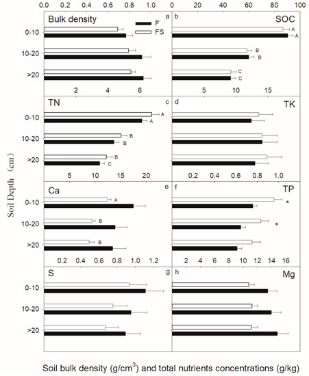 As shown in Figure 6, no significant difference was noticed in soil bulk density and the content of total soil elements between the two types (F and FS) except Total P (TP) in the top 20-cm layer (t-test, p < 0.05). Soil Organic Carbon (SOC) and Total N (TN) concentrations considerably reduced with the increase in soil depth (one-way ANOVA, p < 0.05). Ca nutrients were only significantly reduced in the F stand, and this behavior was not notice with the same magnitude for the FS stand. Overall, the other nutrients and the soil bulk density did not change significantly with an increasing soil depth.