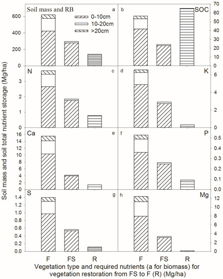 Figure 6 also confirms that most of the corresponding nutrients were stored at 0–10 cm of depth. The soil content in the FS stand was only 47.78% of the F. Moreover, the soil volume and nutrient content of the soil layer below 10 cm was extremely small. In the F stand, total soil mass, SOC, N, K, Ca, P, S and Mg stocks were 618.86, 56.31, 3.68, 6.55, 15.52, 0.53, 1.39 and 12.41 Mg/ha, respectively (Figure 7). In the FS stand, total soil mass, SOC, N, K, Ca, P, S and Mg stocks were 295.69, 24.18, 1.85, 2.90, 4.20, 0.26, 0.56 and 3.35 Mg/ha, respectively (Figure 7). The nutrient demand associated with the restoration of vegetation (R) was lower than the total amount of elements in the FS.