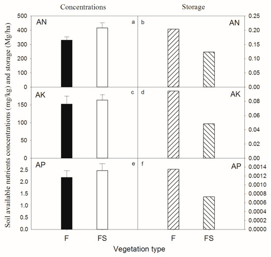 F and FS soil plant-available N, K and P concentrations showed no significant difference (t-test, p > 0.05). Soil plant-available nutrient content was very low, only between 0.26%–2.55% of the total element content. In the F stand, soil AN, AK, and AP stocks were 0.20, 0.094 and 0.0014 Mg/ha, respectively (Figure 8). In the FS stand, soil AN, AK, and AP stocks were 0.12, 0.048 and 0.00073 Mg/ha, respectively (Figure 8). They were far below the nutrient requirements for vegetation restoration.