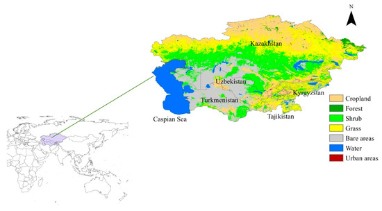 Central Asia is located in central Eurasia and is adjacent to China in the west and the Caspian Sea in the west. Its geographical range is 35°08′–55°25′ N, 46°28′–87°29′ E. The total area is approximately 3970 million ha. It has a temperate continental climate and uneven distribution of rainfall. The annual precipitation ranges from 100–400 mm, and it can be more than 500 mm in high mountain areas and less than 200 mm on plains [7].