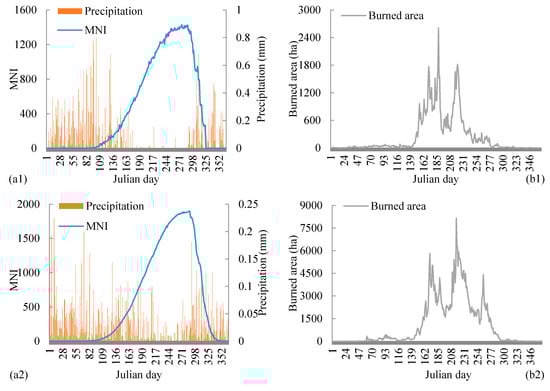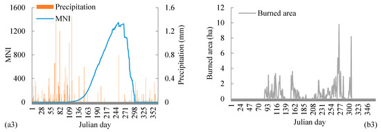 The fire season of each vegetation zone could be defined by the fire weather index and the daily burned areas. The daily burned areas for R1, R2, and R3 showed apparent changes during the periods of days 150–280, 140–300, and 90–305, respectively (Figure 3(b1–b3)). However, there were some grass fires during days 60–140. The dates of the increases in daily burned areas were earlier than that of the increases in MNI. In early spring, the fuels are dry and cured grass, which can burn at low MNI conditions. The date when the daily burned areas decreased to zero was also earlier than the date when the MNI reached a very low value. The MNI only indicates fire weather, which does not reflect the seasonal status of live fuel. Although daily burned areas showed a relationship with the MNI (r > 0.23), their changes were not completely consistent.
