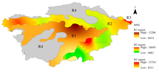 During the period from 2001–2015, the mean MNI in the R1 fire season was 10,213. The high MNI values were distributed in the central areas, especially in the middle part near R2 (MNI > 12,000) (Figure 4). The mean MNI of R2 was 12,104, and the high MNI values were distributed in the northwestern and south-central parts. The mean MNI of R3 was 10,769 (Figure 4).