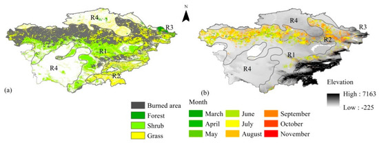 Grassland fire and shrub fire mainly occurred in summer (June–September), and the largest burned areas in grassland usually occurred in August or September [21]. The fires in mountain forests in the low altitude regions mainly occurred in spring (April–June) and autumn (September and October). Nevertheless, the fires mainly occurred in summer (July and August) for the forests at high-altitude areas (>1500 m ALS). Fires in mountain forests are usually distributed in areas near farmland or towns, which indicates that human activities impact these occurrences. The references indicated that most forest fires were ignited by humans in low-altitude areas and fires in high-altitude areas in summer were mainly caused by lightening [4,18].