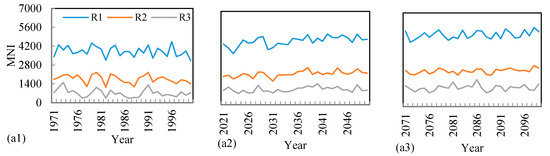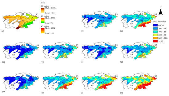 The MNI values were high in the northwest of R3 (1163–1353) and low in the southeast (322–599) at the baseline. The mean MNI will increase by 49%, 77%, 49%, and 68% in the 2030s over the baseline under the RCP2.6, RCP4.5, RCP6.0, and RCP8.5 scenarios, respectively. In the 2080s, the mean MNI will increase by 32%, 84%, 127%, and 146% under the RCP2.6, RCP4.5, RCP6.0, and RCP8.5 scenarios, respectively. A greater increase in MNI will be distributed in the northwestern and central areas under the RCP2.6 scenario, while MNI will increase clearly in the northwest of R3 under the other scenarios.