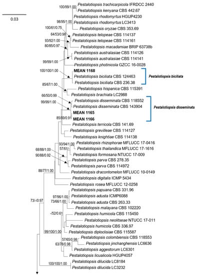 Phylogenetic analyses allowed to identify the remaining isolates obtained in this study as belonging to four different species of Pestalotiopsis: Pe. australis (five isolates), Pestalotiopsis disseminata (Thüm.) Steyaert (two isolates), Pestalotiopsis biciliata Maharachch., K.D. Hyde & Crous (one isolate) and Pestalotiopsis hollandica Maharachch., K.D. Hyde & Crous (one isolate). Isolates MEAN 1109, MEAN 1110, MEAN 1096, MEAN 1111 and MEAN 1112 formed a clade along with reference strains of Pe. australis. MEAN 1165 and MEAN 1166 clustered with strains of Pe. disseminata. Isolate MEAN 1168 grouped with Pe. biciliata, while isolate MEAN 1091 was closely related to Pe. hollandica.