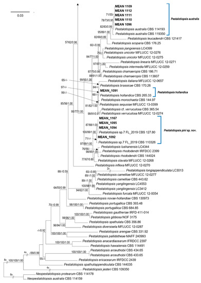 Pestalotiopsis pini isolates obtained in this study (MEAN 1095, MEAN 1092, MEAN 1094, MEAN 1167) were grouped along with two unclassified Pestalotiopsis sp. strains included in the revision of Sporocadaceae, performed by Liu et al. [3], namely CBS 110326 and CBS 127.80. In the latter study, the authors retained these two isolates as an “informal species” “Pestalotiopsis sp.7 FL-2019”, due to the lack of more isolates and limited phylogenetic support. In our phylogenetic analyses (Figure 1), these two strains were grouped with the four isolates obtained in this study, forming a separate clade with strong support values in all the phylogenetic analyses performed (MLBS = 100%, MPBS = 99%, BIPP = 1.00).