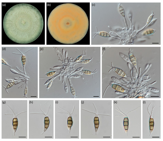 Pestalotiopsis pini (MEAN 1094). (a,b) Colony on PDA after 10 days at 23 ± 2 °C—surface view and reverse, respectively. (c–f) Conidiophores, conidiogenous cells and attached conidia. (g–l) Conidia. Scale bars: 10 µm.