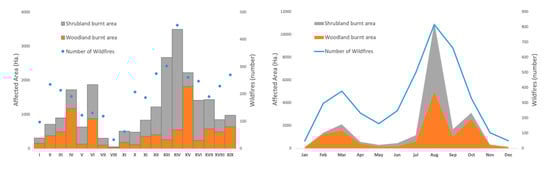 Average number of fires, affected woodland area and damaged shrub area (in hectares) in Galicia. Left: per forest district; Right: per month (data obtained from the Galician Statistical Office [24]).