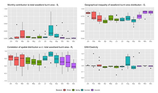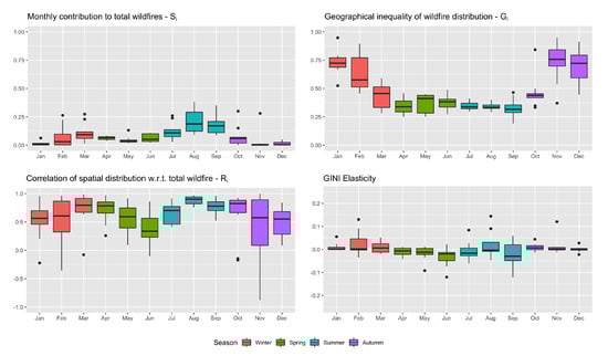 Finally, as indicated in the introduction, the Gini index could be used to classify and compare fire activity across different regions in the world. This would require full access to the relevant data for these different regions, and performing the same calculations explained in Section 2. In order to classify and compare the regions, it is sufficient to calculate the overall (spatial and/or temporal) Gini index. Further information about the origin of the obtained value, the contributions from the different months or subregions, and how strongly modifications to each of these would affect the overall inhomogeneity indicator can be obtained by a more detailed space-time decomposition such as the one that we have here presented for Galicia.