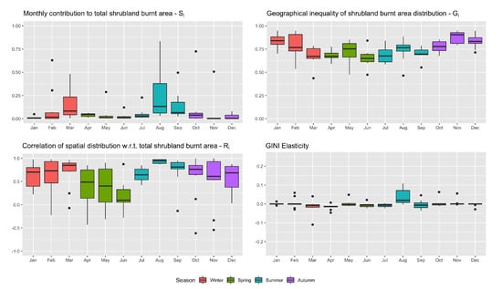 Finally, the results obtained for the burned shrubland area are found in Figure 7. Similar results are obtained for the analysis of the woodland. March, August and September are again the dominant months in terms of contribution. Late autumn and early winter are the periods with the largest spatial inhomogeneity. Correlations are, on average, always positive, and high in August, as well as in March, September and October. The other months have lower average values, but with a relatively high variation. Finally, August is also the dominant month in terms of elasticity. The other months have low average elasticity, although with some significant outliers.
