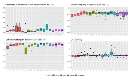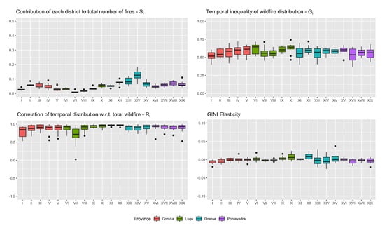 After this general analysis, the Gini decomposition for the three study variables will now be examined, see also Section 4 for cartographic representations of some of the most relevant features. In Figure 9, the temporal concentration of the number of fires is broken down according to the Galician Forest Districts. The districts are grouped by color according to the province to which they belong (Coruña, Lugo, Ourense and Pontevedra). From the first graph, it is seen that the districts of Ourense contribute slightly more to the total number of fires than the districts in other provinces. The monthly inequalities (upper right figure) are rather high for all districts (in the range 0.5–0.7, except for a few outliers). Districts X-XII-XV-XVI are the most stable (smallest variability), while the other districts have larger temporal variability. All the registered correlations are positive, and (in average terms) all of them are high. This indicates that the temporal inhomogeneity pattern is very similar to the overall pattern in the whole of Galicia, and that the study of elasticities is valid in most of these districts. This elasticity is low in absolute terms for all districts, but shows substantial variability in all Districts in Ourense (except XI), as well as in Districts X-XVII-XIX. The elasticity of these districts can take on different signs, and so they should be taken into account carefully to manage the concentration of fires.