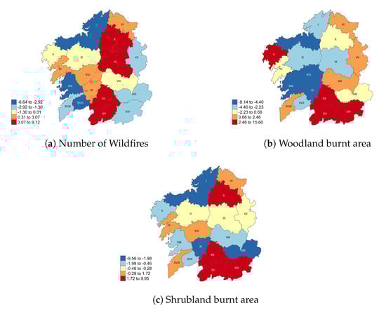 The inhomogeneity distribution for the burned shrubland area is quite different. Here, the two main blocks lie in the northeast (districts I, VI, VII and IX) and the southwest (IV, XIX, XVIII, XVII, XII and XV). These patterns have mainly a relative importance, in the sense that all districts present medium-to-high inequality indices in the same range ( for the number of wildfires, and for the affected area). Nevertheless, the difference in the inhomogeneity patterns between the number of wildfires and affected woodland area on the one hand, and the affected shrubland area, on the other hand, is curious, and can probably be related to the influence of climate in the different parts of Galicia [69,70], and its impact on both the vegetation types and the wildfire distributions.