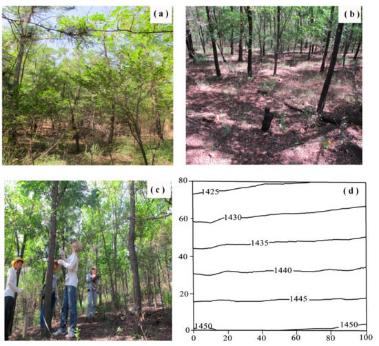 The R. pseudoacacia and P. tabuliformis mixed plot is 8000 m2 and it was revegetated in the year 1993. The plot was characterized by slope with the elevation ranged from 1420 m to 1455 m (Figure 1). In the initial stage of reclamation, the seedlings of R. pseudoacacia were about 30 cm height at the age of 1 year and that of P. tabuliformis were 100 cm height at the age of 5 years. All the seedlings were planted by line spacing of 1 m. R. pseudoacacia were planted with interval of 1.5 m and P. tabuliformis of 5 m. Every three rows of R. pseudoacacia were interplanted by one row of P. tabuliformis. The total seedling density was about 6400 plants ha−1, among which the density of R. pseudoacacia was approximately 6000 plants ha−1 and that of P. tabuliformis was 400 plants ha−1. In particular, 224 R. pseudoacacia stems were cut in the year 2007 (14 years after reclamation) due to fierce competition [12].