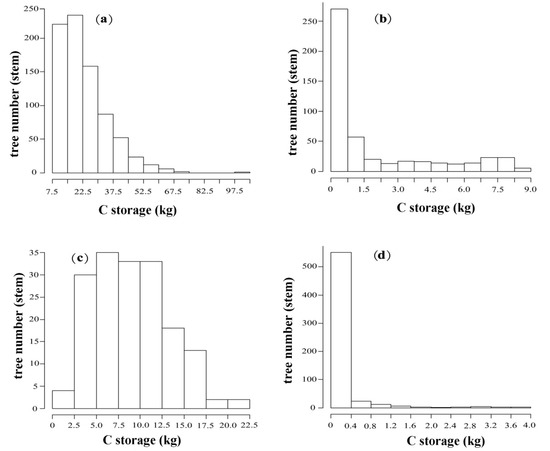 Histograms of biomass C class for each tree species in Pingshuo opencast coal mine, China. (a) Planted R. pseudoacacia; (b) Seeded-in R. pseudoacacia; (c) P. tabuliformis; (d) U. pumila.