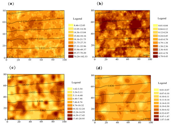 Spatial distribution of biomass C (kg per plant) in Pinshuo opencast coal mine, China. Black lines denote contours marked with elevation values (m ASL). Axis scale is in meters. (a) Planted R. pseudoacacia; (b) seeded-in R. pseudoacacia; (c) P. tabuliformis; (d) U. pumila.