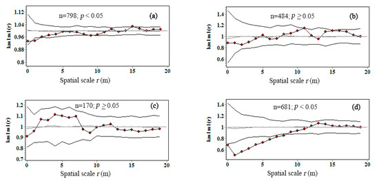 where, is the intersection area of corresponding windows of and which are typical points of the point pattern in the study plot and is Epanechnikov kernel function. We followed the instructions suggested by [40] for further details. The univariate and bivariate mark correlation functions were computed in Programita grid-based software [40]. The analyses were performed up to 20 m with 1 m lag distance. In mark correlation function, detection of spatial patterns that differed significantly from complete spatial randomness expectation required the construction of envelopes based on Poisson null model simulations. For descriptive analyses, envelopes were calculated based on the fifth highest and lowest of 199 Monte Carlo complete spatial randomness simulations, corresponding to a goodness-of-fit (GoF) test with [41]. If kmm(r) was above the envelop curve, the marks (C) were positively correlated, if kmm(r) was down the envelop curve, the C were negatively correlated, otherwise, the C were independent.