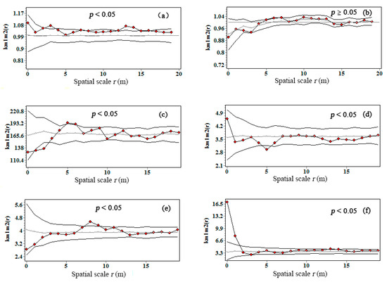 Bivariate mark correlation function km1 m2(r) for interspecific interaction on C accumulation in Pinshuo opencast coal mine, China. Gray line indicated the theoretical kmm(r); black line with red dots indicated the observed the kmm(r); black line without red dots indicated the 95% simulation envelops. (a) Planted R. pseudoacacia vs. seeded-in R. pseudoacacia; (b) planted R. pseudoacacia vs. P. tabuliformis; (c) planted R. pseudoacacia vs. U. pumila; (d) seeded-in R. pseudoacacia vs. U. pumila; (e) seeded-in R. pseudoacacia vs. P. tabuliformis; (f) P. tabuliformis vs. U. pumila.