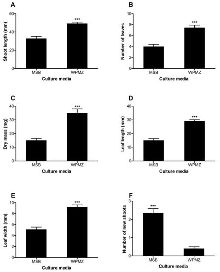 Effects of MSB and WPMZ media on the (A) shoot length, (B) number of leaves, (C) dry mass, (D) leaf length, (E) leaf width and (F) and number of new shoots of SM904 chestnut hybrid. Bars indicate standard error of the mean of 45 shoots. Significant differences are indicated with *** (p < 0.001; Mann–Whitney test).