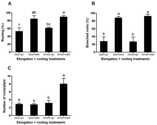 Effects of elongation and rooting media combinations (MSB + H2O, MSB + MMN, WPMZ + H2O, WPMZ + MMN) in (A) rooting percentage, (B) percentage of branched roots and (C) number of roots/plant. Data represent means of 3 replications of 20 shoots each. Bars indicate standard error. Means with different letters are significantly different (ANOVA and Tukey’s test, p < 0.05).