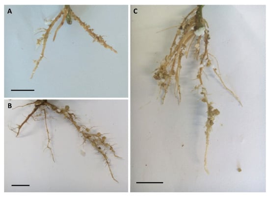 SM904 roots 3 weeks after induction with 1 g/L indole-3-butyric acid (IBA) and development (A) in distilled water and (B,C) adapted MMN. Shoots were previously elongated in (A,B) MSB and (C) WPMZ. Bar = 1 cm.