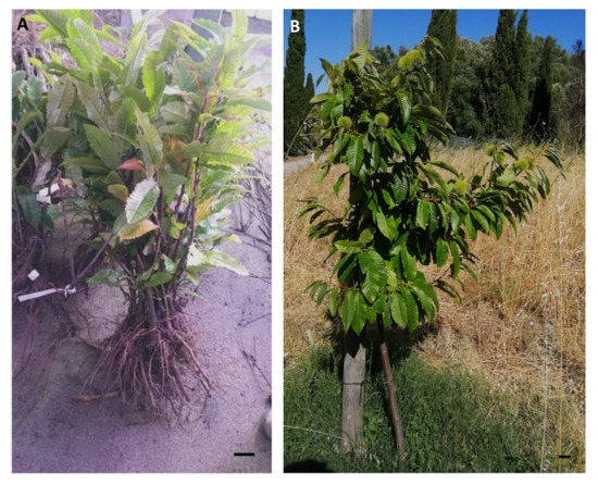 The European chestnut (Castanea sativa Mill.) is a multipurpose tree, having a significant economic interest for nut and wood production. Chestnut cultivars have been maintained by clonal propagation using agronomic techniques such as rooting of cuttings. However, rooting of mature chestnut tissue has proven to be a very difficult process [1,2]. Traditionally, chestnut cultivars were propagated by grafting onto seedlings of C. sativa [3]. However, due to the high susceptibility of this species to the oomycete Phytophthora cinnamomi Rands (the causal agent of root rot/ink disease) [4], the use of grafting has become compromised. Hybrid clones of C. sativa with Castanea crenata Siebold and Zucc. or Castanea mollissima Blume—the Asian species resistant to P. cinnamomi—are recommended as resistant rootstocks for plantations in affected areas [3,5]. The available genotypes in the European market are from breeding programs from the 20th century [3,6]. Changes projected in the distribution of the pathogen due to climate change [7] may lead to differences in disease expression (due to the emergence of new strains and hosts). This creates a demand for new chestnut material, better adapted to the current and predicted future climatic conditions. Therefore, new genotypes with improved resistance to P. cinnamomi were selected from the Portuguese chestnut breeding program, initiated in 2006 [8,9].