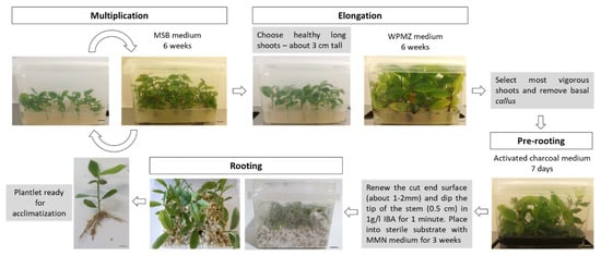 The Portuguese chestnut breeding program benefits from a reliable tissue culture protocol that enables us to manage large scale vegetative propagation of chestnut. The proposed protocol is described in Figure 6 and includes the following steps: (1) maintenance of chestnut shoots in vitro in MSB medium for six weeks; (2) elongation with WPMZ for six weeks; (3) pre-rooting in the activated charcoal medium for seven days; (4) auxin hormonal shock with 1-g/L IBA for one minute, followed by placing the shoots into perlite:vermiculite (1:1) mixture wet with adapted MMN liquid medium for three weeks. Currently, other chestnut hybrids (C. sativa × C. crenata), C. sativa and C. crenata genotypes are being produced by this method at our laboratory for research and production purposes (NEW Cast Rootstocks-https://projects.iniav.pt/NewCastRootstocks).