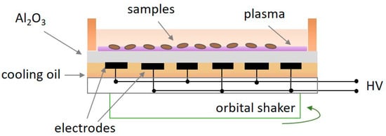 DCSBD plasma treatment (Figure 1) was performed at different exposure times: 1, 3, 5, 10, 15, 20, 30, and 60 s. After switching on the plasma at the applied power of 400 W, seeds were put into the plasma for the specific time and moved rotationally. Rotational movement of the seeds was carried out by the orbital shaker, which moved the whole discharge panel at the frequency of 330 rpm for the homogeneous plasma treatment of the seeds.