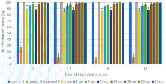 It was found that all plasma treatments (for different exposure times) showed relatively high values of disinfection efficiency (more than 85%) during all days of seed germination (Figure 2). The highest disinfection efficiencies were observed after 3 s, 5 s, 15 s, 20 s, 30 s, and 60 s of plasma treatment with no statistical difference between these six treatments and Control 1 and 3, which were subsequently different from Control 2 (Table 1).