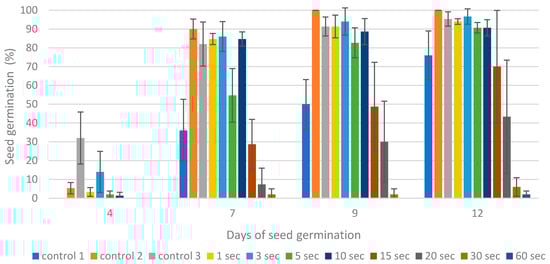 Germination rate of Scots pine seeds exposed to different times of non-thermal plasma treatment after the 4th, 7th, 9th, and 12th days of seed germination. Control 1, control 2, and control 3, see Figure 2.