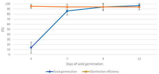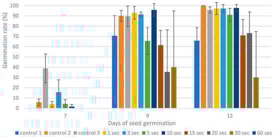 All data including the sets of the three controls, measured at the end (12th day) of the experiment, are summarized in Table 1. The highest seed germination was observed when seeds were treated with plasma for 3 s on all measurement days while the lowest with plasma treatment for 60 s (Figure 3). The highest seed germination rate (GR) after seven days of cultivation was found when seeds were treated with plasma for 3 s. In contrast, the highest GR after nine and 12 days of cultivation was observed for seeds treated with plasma for 10 s in both cases (Figure 4). The germination index calculated for the end of the cultivation period (12th day) was highest when seeds were treated with plasma for 3 s (Table 1). The sterilization effectiveness was at the level of 95.3% on the 4th while on the 7th, 9th, and 12th day of seed cultivation, the level of sterilization effectiveness was at 94.0%. A total of 14.0% of the seeds germinated on the fourth day, while 86.0% germinated on the seventh, and 96.7% germinated on the twelfth day of seed cultivation (Figure 5).