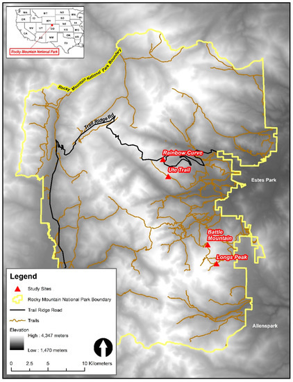Locations of the four study sites in Rocky Mountain National Park, Colorado, U.S.A., are shown with park trails and roads over a 30 m × 30 m digital elevation model (DEM) of the region.