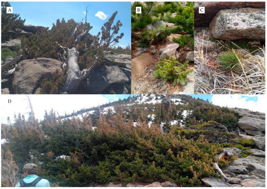 The alpine treeline ecotone (ATE), the transitional zone between subalpine forest and alpine tundra, is a mosaic of alpine tundra vegetation such as cushion plants and graminoids, bare substrate, rocks, and semi-upright or krummholz trees growing individually or together in tree islands on the landscape [1,2,3,4,5,6]. The term “krummholz” is German for “crooked wood” and refers to trees that have a stunted, twisted, or mat-like growth form due to harsh conditions at high elevations [7]. The ATE, extending from the timberline (the upper limit of subalpine forest) to treeline (the upper limit of tree growth) [8], is considered highly sensitive to climate change given its close correlation with isotherms, especially mean air and root zone temperatures [4,9,10]. Fluctuations in treeline position also correlate with past climate records, reflecting temperature increases and decreases over time [2,11,12,13,14]. Treelines worldwide have been predicted to advance upward as global average temperatures increase [14]. However, only 52% of treelines—examined between 1900 and 2006—had advanced in response to increases in average temperature [15], indicating that the temperature–treeline relationship is complex and impacted by other variables.