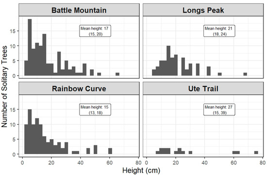 Solitary tree heights are displayed for the four study sites. Mean height (cm) and 95% confidence intervals are displayed in the text boxes. Where confidence intervals do not overlap, differences are significant at the α = 0.05 threshold.