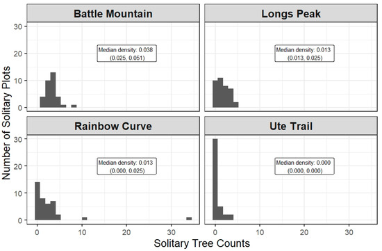 Solitary trees generally occurred at low densities across all study sites, except where moister microsites or shelter occurred such as in an area of high snowmelt runoff near the road at the Rainbow Curve study site (Figure 4). Within the 5-m-radius plots (78.54 m2), counts were almost always <10 trees (Figure 4). Median density ranged between 0.000 trees/m2 at the Ute Trail study site and 0.038 trees/m2 at the Battle Mountain study site. The Ute Trail study site had significantly lower solitary tree density than the Battle Mountain, Longs Peak, or Rainbow Curve study sites. The Battle Mountain study site had a significantly greater density of solitary trees than the Longs Peak study site (Figure 4).