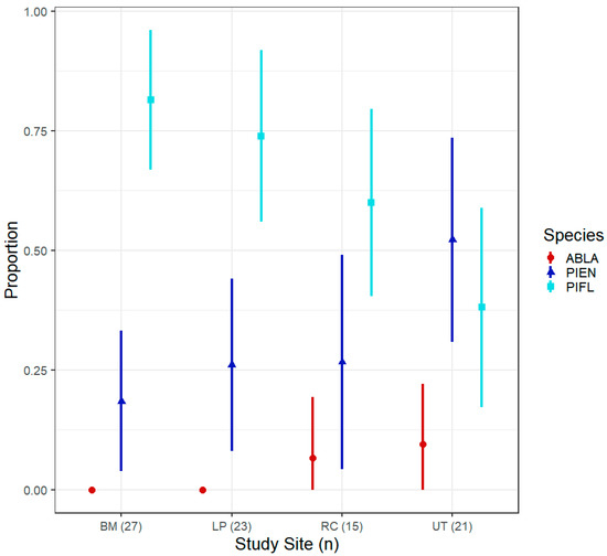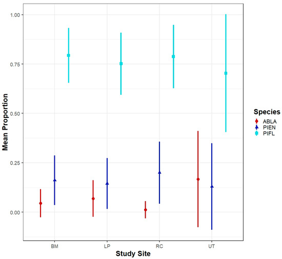 Mean species proportions and 95% confidence intervals for solitary plots are shown for subalpine fir (ABLA), Engelmann spruce (PIEN), and limber pine (PIFL) at the Battle Mountain (BM), Longs Peak (LP), Rainbow Curve (RC), and Ute Trail (UT) study sites. Where confidence intervals do not overlap, differences are significant at the α = 0.05 threshold.