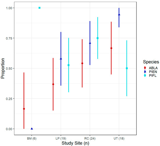 Proportion of multi-tree islands that included subalpine fir (A. lasiocarpa—ABLA), Engelmann spruce (P. engelmannii—PIEN), and limber pine (P. flexilis—PIFL) at the Battle Mountain (BM), Longs Peak (LP), Rainbow Curve (RC), and Ute Trail (UT) study sites. The number of multi-tree islands at each site is in parentheses. Proportions do not add to one because a multi-tree island may contain more than one species. Where confidence intervals do not overlap, differences are significant at the α = 0.05 threshold.