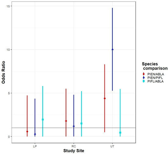 The Battle Mountain study site was excluded from this analysis because limber pine was the tree island initiator for all sampled multi-tree islands. The 95% confidence intervals of all odds ratios spanned 1.0 across all study sites apart from the Ute Trail study site, indicating that no species was significantly more likely to be the initiator than any other. At the Ute Trail study site, Engelmann spruce was the tree island initiator significantly more often than limber pine.