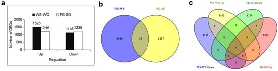 Number of differentially expressed genes (DEGs) identified by pairwise comparisons. (a) Number of up-regulated and down-regulated DEGs in the comparisons of water-saving (WS) and water-consuming (WC) yellowhorn, as well as fast-growing (FG) and slow-growing (SG) yellowhorn under drought conditions. (b) Number of the overlapping and uniquely DEGs in the comparisons of WS-WC and FG-SG. (c) Venn diagrams of the overlapping and uniquely up-regulated and down-regulated DEGs in the comparisons of WS-WC and FG-SG.