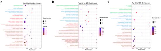 Scatter plot of top 30 gene ontology (GO) terms enriched by differentially expressed genes (DEGs). (a) Top 30 GO enrichment terms by DEGs in WS-WC. (b) Top 30 GO enrichment terms by DEGs in FG-SG. (c) Top 30 GO enrichment terms by the overlapping DEGs between WS-WC and FG-SG. GO category includes green cellular component, blue molecular function and red biological process. WS-WC indicates the comparisons of water-saving and water-consuming yellowhorn; FG-SG indicates the comparisons of fast-growing and slow-growing yellowhorn.