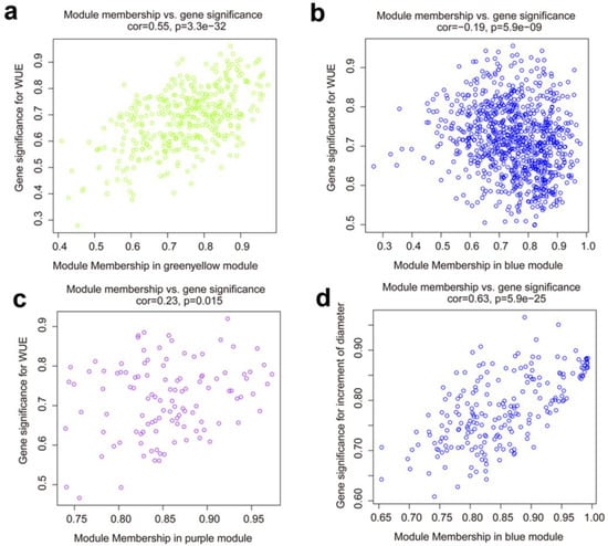 Scatter plot of module membership and gene significance of identified modules. (a–c) The correlation of module membership and gene significance of greenyellow (a), blue (b) and purple (c) modules that associated with water use efficiency (WUE). (d) The correlation of module membership and gene significance of blue module associated with increment of diameter.