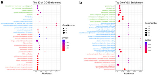 Scatter plot of top 30 gene ontology (GO) terms enriched by differentially expressed genes (DEGs) in greenyellow and blue modules. (a) GO enrichment terms by DEGs in greenyellow module associated with water use efficiency (WUE). (b) GO enrichment terms by DEGs in blue module that associated with increment of diameter. GO category includes green cellular component, blue molecular function and red biological process.