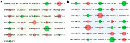 Networks of hub genes in selected greenyellow (a) and blue (b) modules. Red nodes indicate up-regulated genes; green nodes indicate down-regulated genes. The size of nodes is determined by intra-modular connectivity (KME). The width of edges is determined by weight.