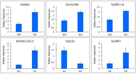 To validate the accuracy of the transcriptome data, six hub genes related to the WUE and increment in diameter were selected for qRT-PCR analysis. The relative expression levels of XsMIK2, XsNAC008, and XsNRT1.4L decreased in WS type yellowhorn, and those of MSTRG.1821.9 and XsARF2 decreased in SG type yellowhorn, while those of XsFLS2 increased in SG type yellowhorn (Figure 7). These results exhibited similar expression patterns to the results of RNA-Seq.