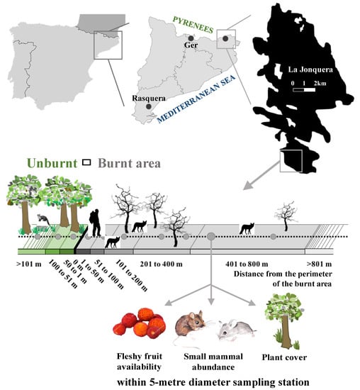 Location and schematic representation of the sampling methods. Location of the three study areas in Catalonia (NE Iberian Peninsula), using the La Jonquera burnt area as an example in black [40], and schematic representation of linear transects, perpendicular to the burnt area perimeter with sampling stations (grey dots) at increasing distances from the burnt area perimeter. In each sampling station of 5 m diameter, we measured vegetation structure, production of trophic resources, and relative abundance of small-mammals (with a Sherman live trap).