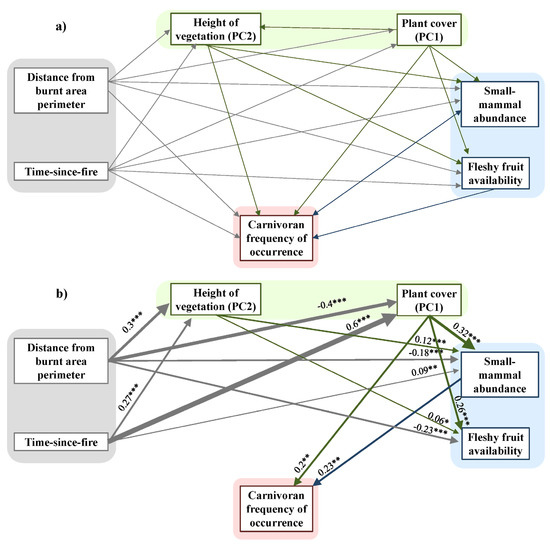 Most parsimonious structural equation models (SEM). Functions shown are carnivoran frequency of occurrence. All paths in the initial models (graph (a)) were treated as optional, and were thus able to be removed during model simplification (from 27 to 22 parameters) using maximum likelihood estimation. As a final model (graph (b)), we selected the model with the lowest AIC score. Values adjacent to paths indicate standardized direct coefficients, with significance indicated by * p < 0.05; ** p < 0.01; *** p < 0.001. The model was constructed using four hierarchical packages: (1) time and distance in relation to fire, (2) habitat structure (first two PCA axis), (3) food availability, and (4) carnivoran occurrence. One-way arrows represent paths between variables.