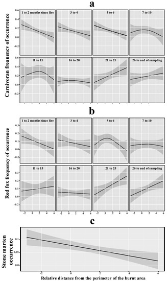 The red fox followed similar trends to those described for the whole carnivoran community and showed greater frequency of occurrence near the burnt area perimeter immediately after fire. However, this species expanded to the inner burnt area and reached greatest occurrence there 21 months after the fire (Figure 3b). Small mammal abundance influenced red fox occurrence as well as fleshy fruit availability and pre-fire shrubland habitat (Table 2). Stone marten frequency of occurrence was not influenced by time–distance interaction or time-since-fire. However, the distance from the burnt area perimeter negatively affected stone marten occurrence (Figure 3c). Furthermore, both a pre-fire forest habitat and greater plant cover positively affected its occurrence. Abundance of small mammals, height of vegetation, and red fox occurrence also had a positive influence on stone marten occurrence (although not significant, they were present in the selected model), while distance from closest refuge showed negative effects. Fleshy fruit availability did not seem to affect this species (Table 2).