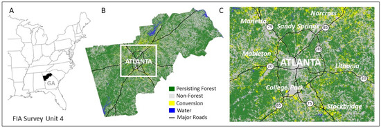 Study area consisting of the Forest Inventory and Analysis survey unit 4 in north central Georgia, USA (black shading, Panel A) surrounding the greater Atlanta metropolitan area (Panel B). The land classification maps shown in Panels B and C identify areas of persisting forest (green) and potential forest conversion (yellow) occurring between 1987 and 2010 (adapted from [25]). Developed from Landsat time series, the maps estimate that nearly 75,000 ha of forest were converted from forest to other land uses during the 23-year period of study. Much of the conversion is concentrated along major roadways, as seen in Panel C.