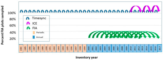 TimeSync [16] is an interpretation tool that enables the extraction of information from more than three decades of Landsat data. Human interpretations were made on all the FIA sample plots using annual Landsat imagery, visualizations of spectral trajectories, and aerial photography through this tool. LULC and the agent of change (if any) were recorded annually on each sample plot from 1984–2017 (blue arrows in Figure 2) using the 30-m pixel intersecting the center FIA subplot (depicted by the orange box in Figure 3).