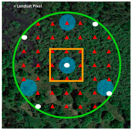 The spatial scale of plot data collected under the three different observation systems. FIA plots involve field data collection within four subplots, depicted by light blue circles. Image-based Change Estimation plots make observations on a sample of dots within a 0.61 hectare circle (light green) surrounding the FIA subplots. For areas with no change from one time period to the next, data are collected only on the five white dots. For plots where change is present, data are collected on all 45 dots (white dots and red triangles combined). Finally, for TimeSync, observations are made for the 30-m pixel intersecting the center FIA subplot, depicted by an orange box.
